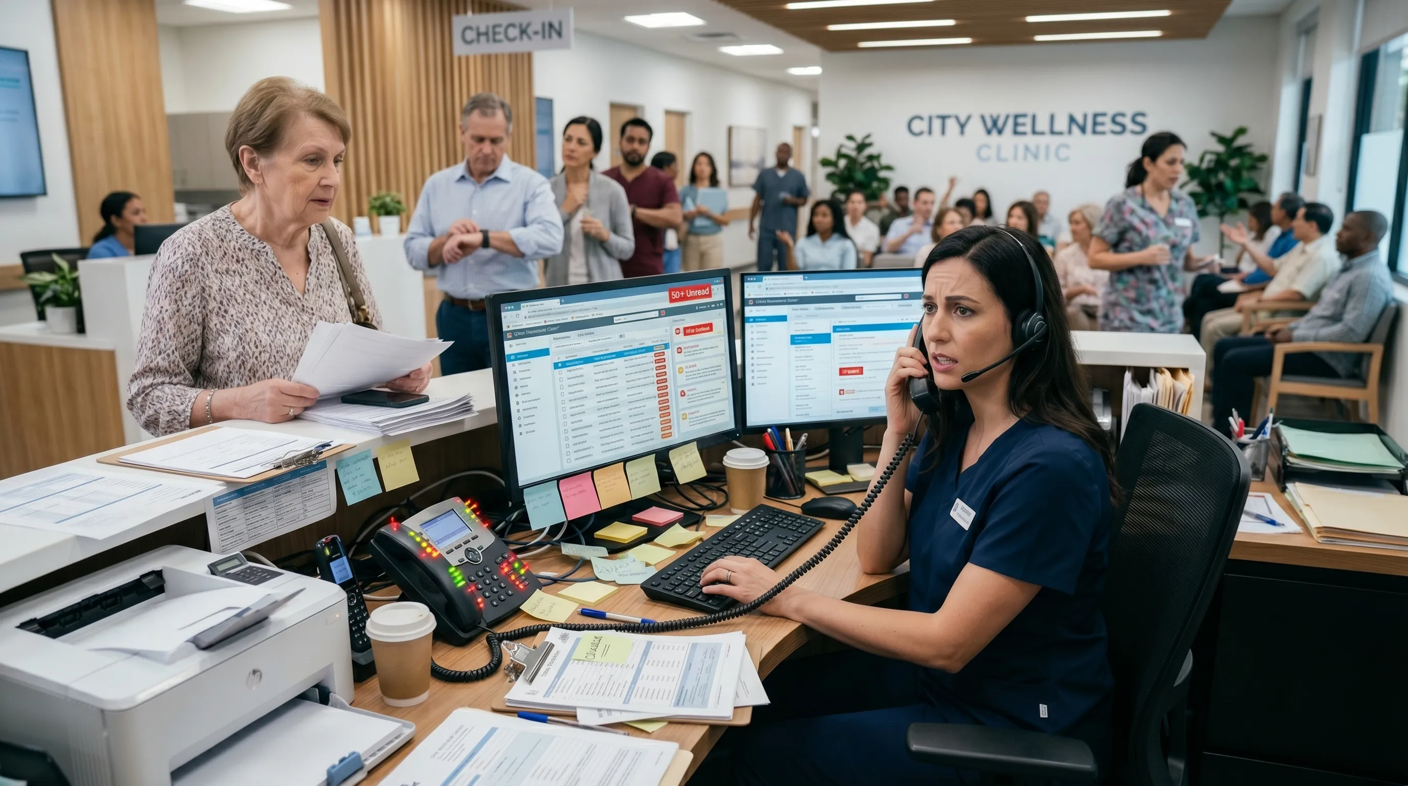 It's 11:14 on a Tuesday morning. The phone at the front desk is ringing. It's been ringing for about 40 seconds, which doesn't sound like much until you realize the receptionist is already on a call, the practice manager is explaining a billing error to a patient standing at the window, and the medical assistant who sometimes helps answer overflow is currently escorting someone to Room 3.
